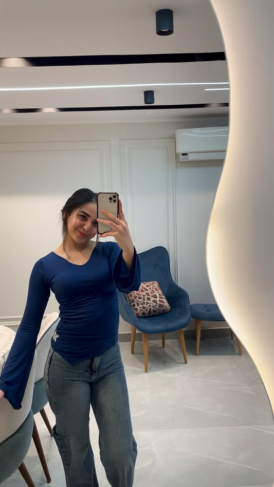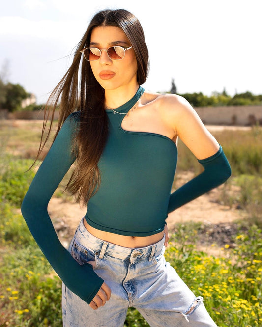 Blue Shades Long Sleeves One Shoulder Drappe Top
